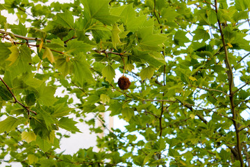 For the best chance of stopping the sweetgum balls hire a certified arborist. This tree is also known as the American planetree or the buttonball tree due to the brown spiky seed. The grayish-brown bark is deeply furrowed.